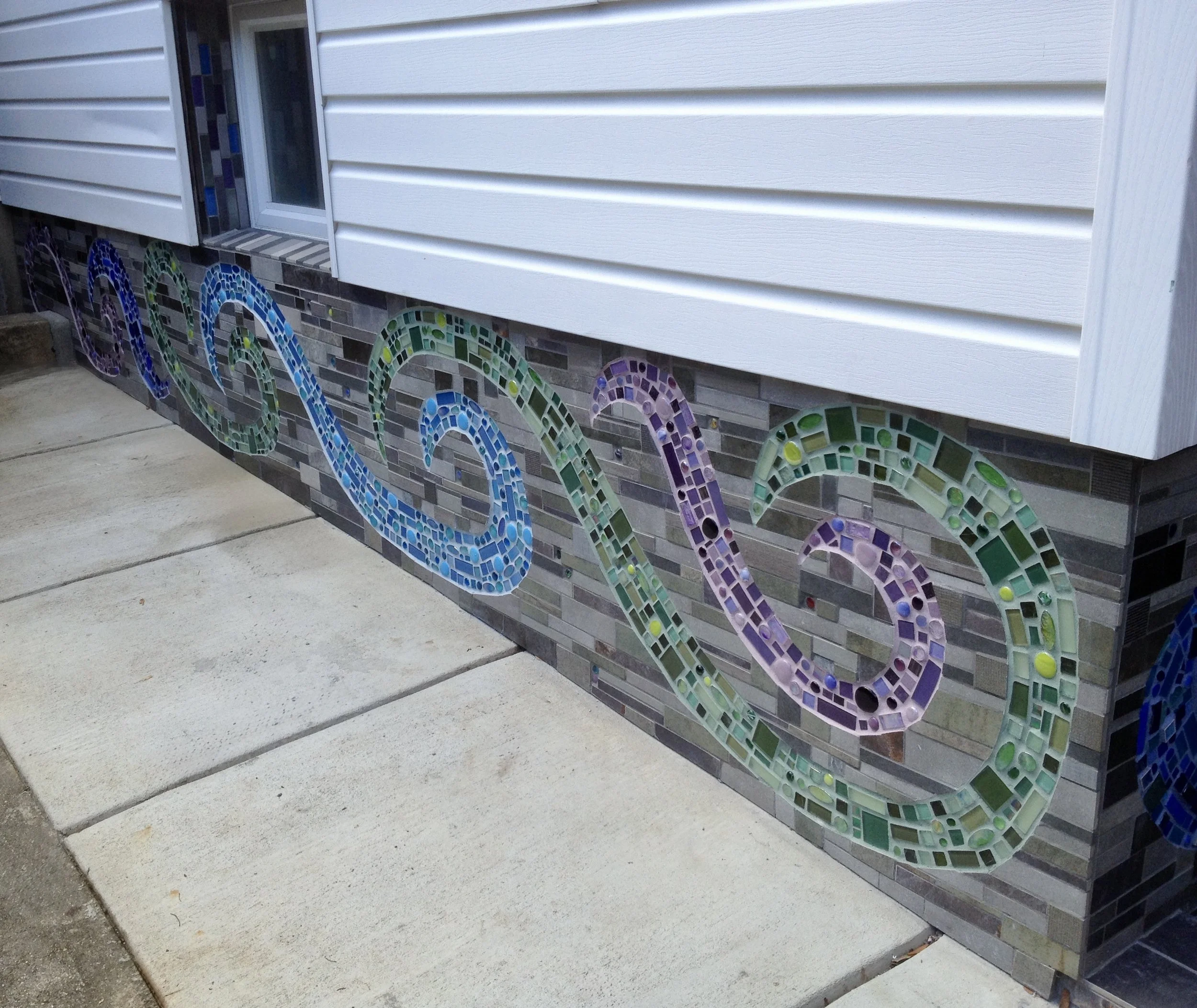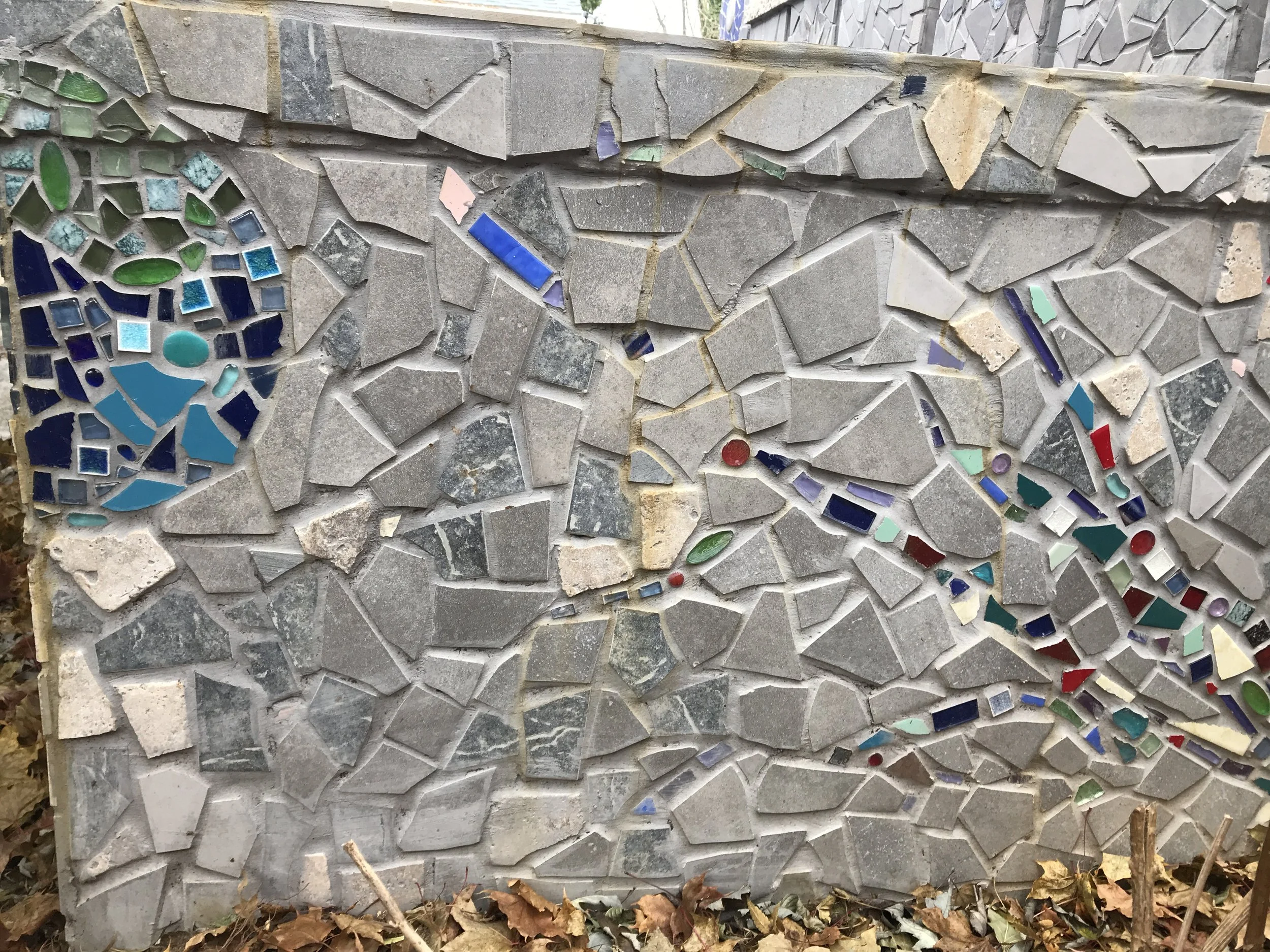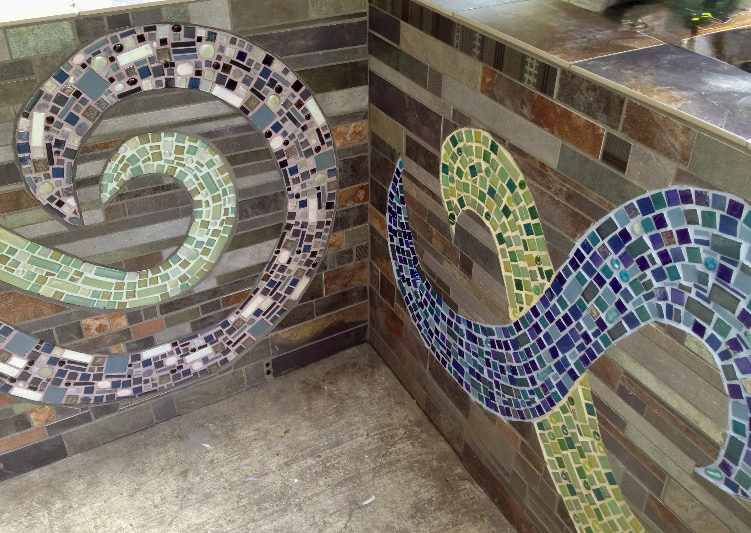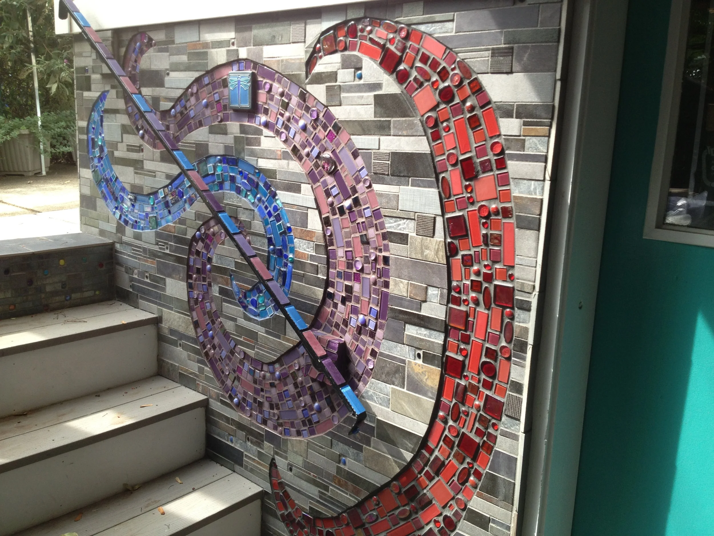 Here’s a sampling of mosaics I’ve made over the years. You’ll find wall mosaics towards the top of this page, and further down the page, some views of more architecturally-oriented work.