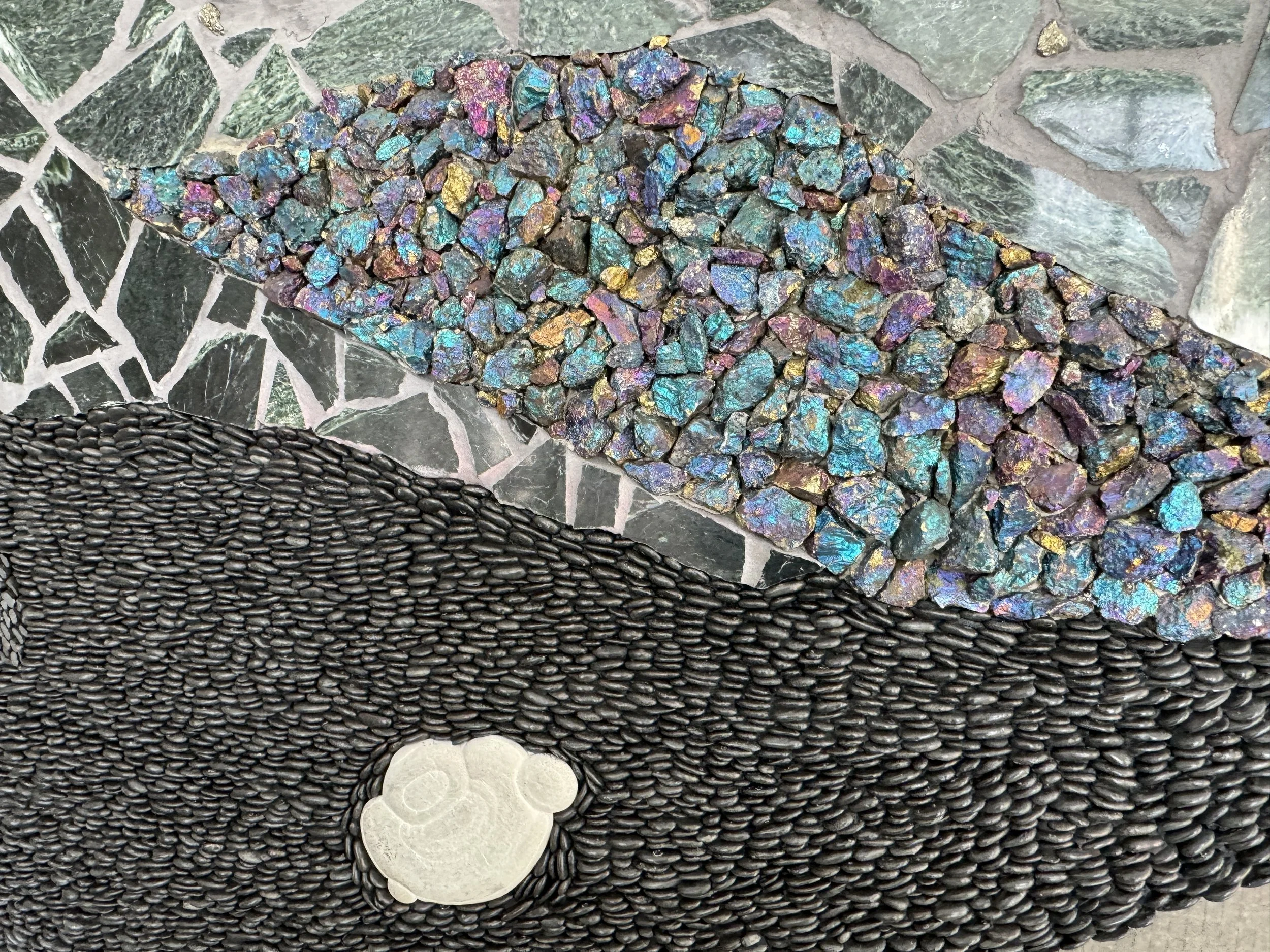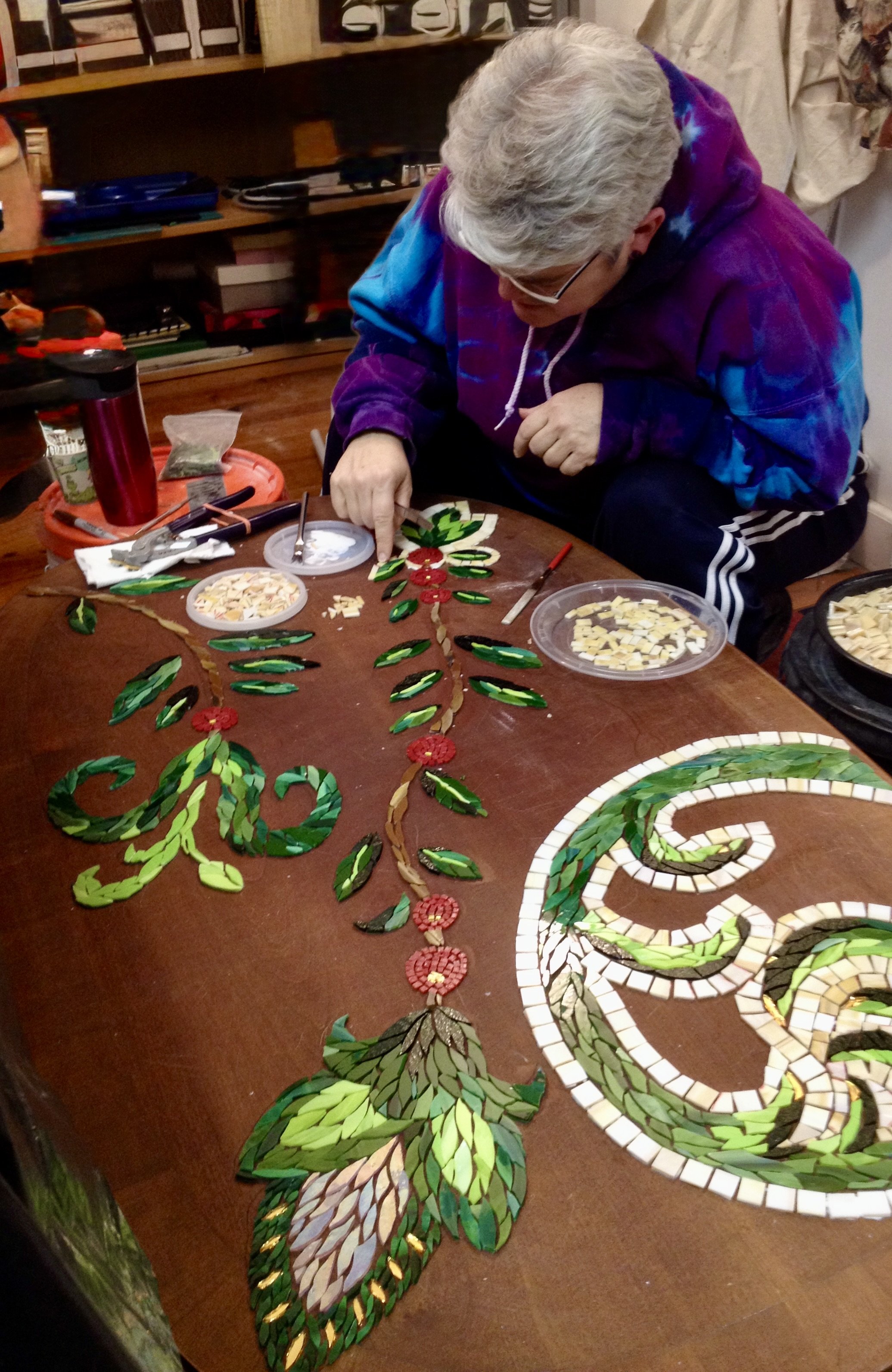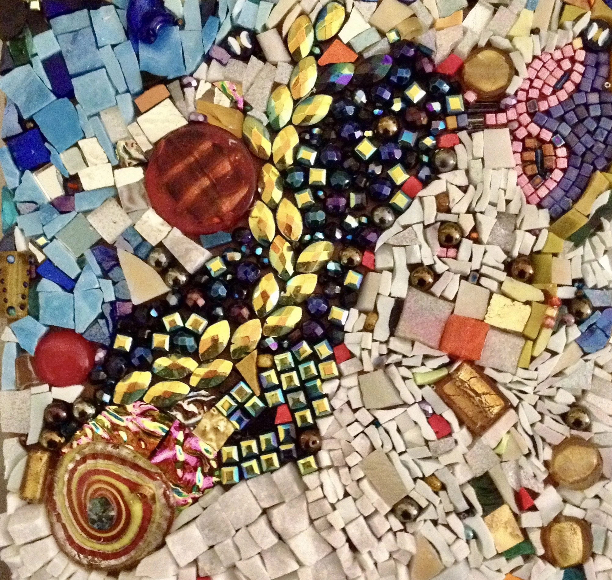 For me, mosaic practice feels a lot like writing poetry. Both are image-intensive. Both require patience. Mosaic art is for the eye, and poetry is art for the mind’s eye. Mosaics uses tone glass, and found objects, while poetry uses phrases and fragments of ideas, but both assemble small bits of things in ways that make sense and meaning out of what we feel, what we see, and what we can’t see. Both rely on lines and line breaks, and both have high hopes for engaging the imagination of the people they encounter!