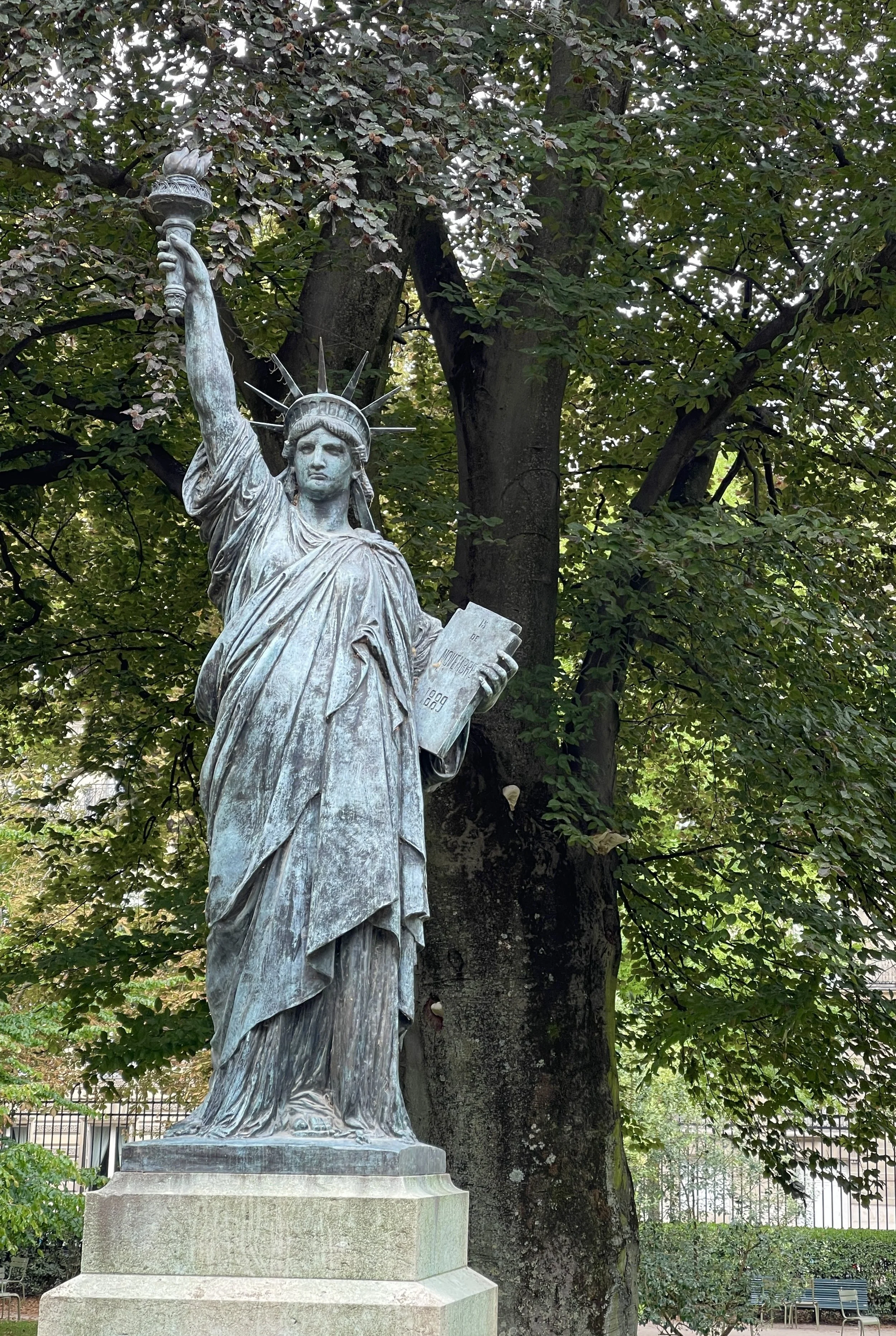 Fifty-three years later in Paris on a tour of Luxembourg Gardens, the guide tells us, a bunch of Americans, that she has a surprise. We turn a corner and encounter a 1/10th scale model of the Statue of Liberty. It is 2.9 meters high, faithful in detail, cast in bronze. My friends express delight, but by the time we are confronted by this tiny Lady Liberty I am already exhausted by being American. Embarrassed. Ashamed. America was never the America I believed in when I was ten. I am not proud. I know nothing is larger than life. Our Colossus knows that freedom and justice are in cages at the border. She knows we reject the tired, the hungry, the poor; that we blame them for their own plight. She knows we are arrogant, divisive, unkind, inhumane. Our Colossus has shrunk. Her beacon is blown out. She is hiding in the greenery along a gravel path in Paris. She is scarred, and she is scared. I am tired and terrified. I cannot comfort her.